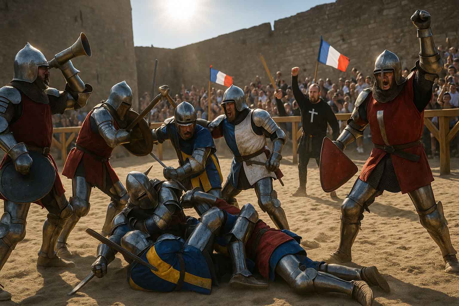 Neben dir johlen Fans, schwenken Nationalflaggen, rufen Schlachtrufe. Ein französischer Ritter versucht, gleich zwei Gegner mit kreisenden Schwertschlägen auf Distanz zu halten, während hinter ihm ein Teamkamerad seinen Gegner packt, dreht und mit einem mächtigen Schwung zu Boden schickt. Die Menge brüllt vor Begeisterung.
