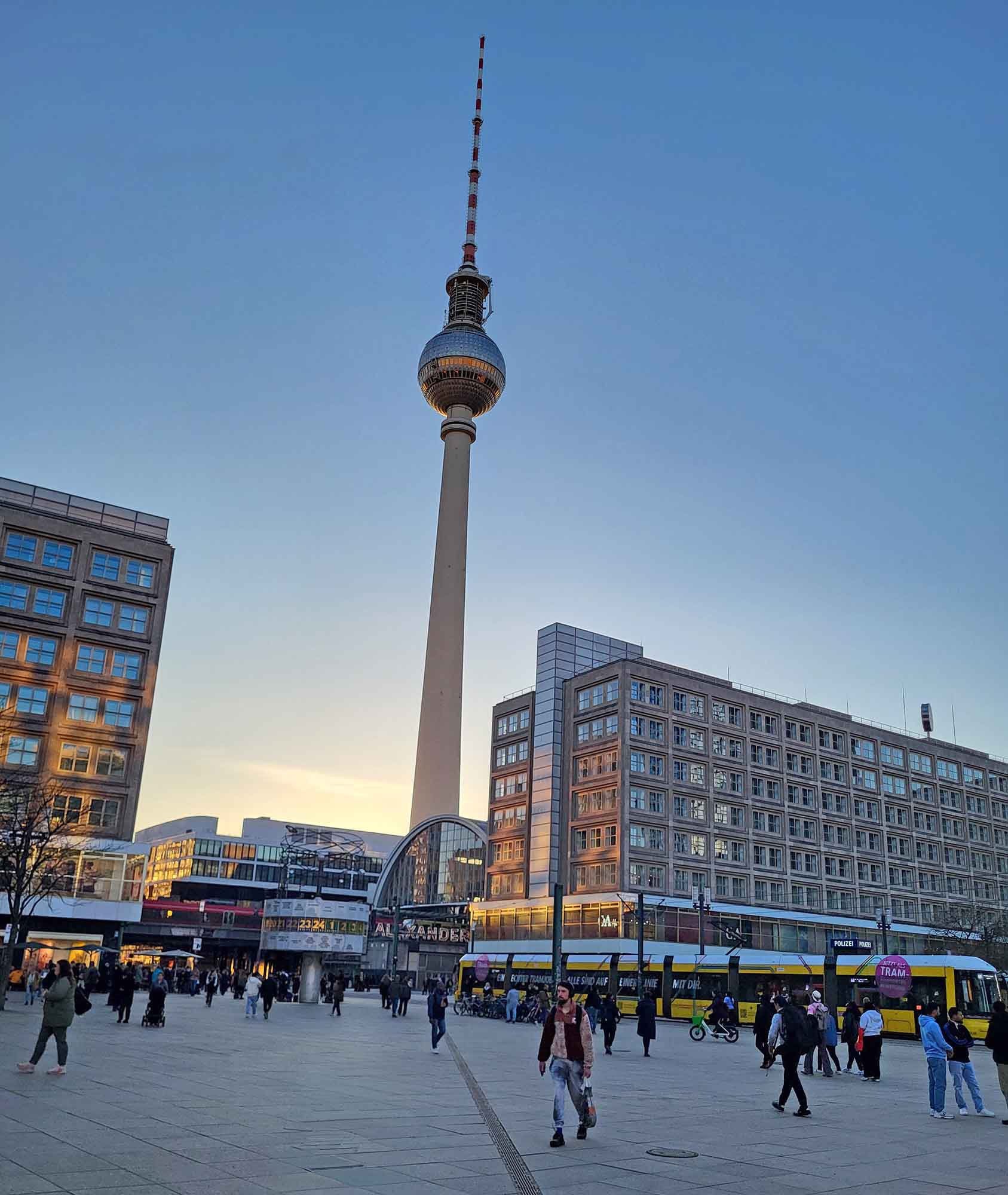 Berliner Fernsehturm am Alexanderplatz in der Dämmerung, umgeben von Gebäuden, Straßenbahn und Passanten.