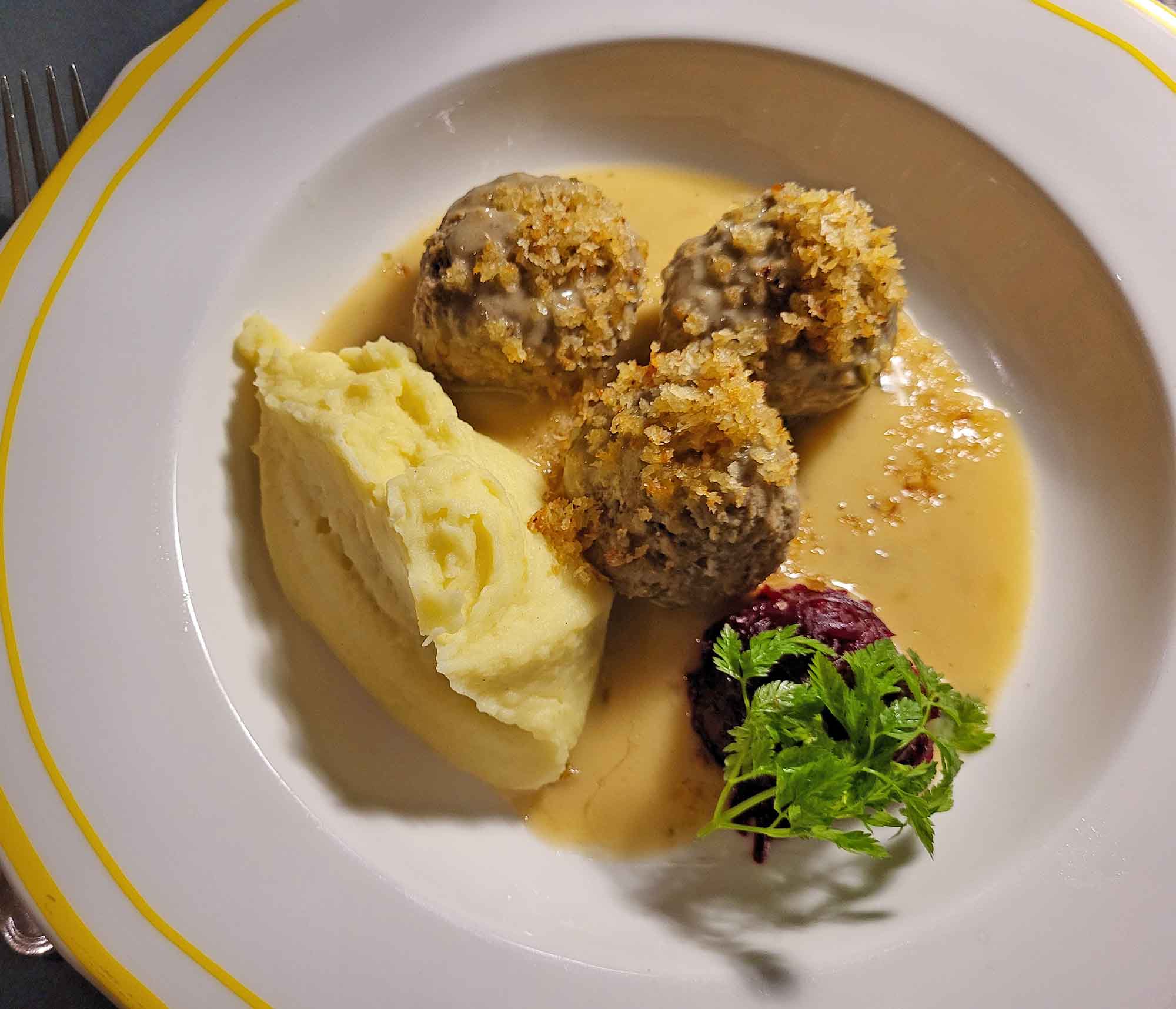 Drei Königsberger Klopse mit Roter Beete und Kartoffelbrei