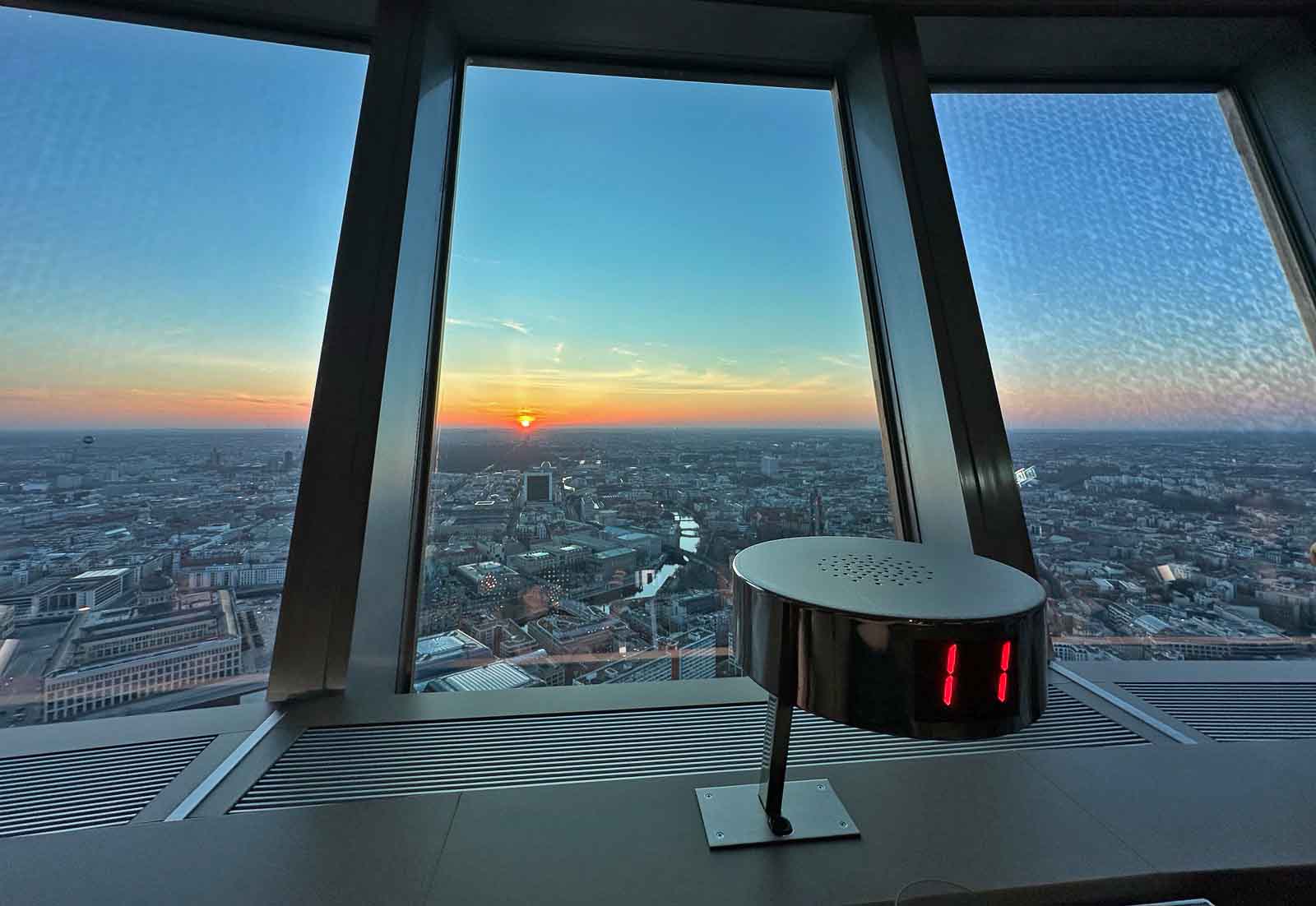 Blick aus dem Restaurant Sphere by Tim Raue im Berliner Fernsehturm auf den Sonnenuntergang über der Berliner Skyline, im Vordergrund ein Tischdisplay mit der Nummer 11.
