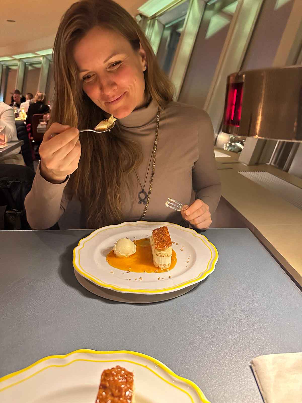Frau probiert ein Dessert im Restaurant Sphere by Tim Raue im Berliner Fernsehturm, vor ihr ein angerichteter Dessertteller auf dem Tisch.