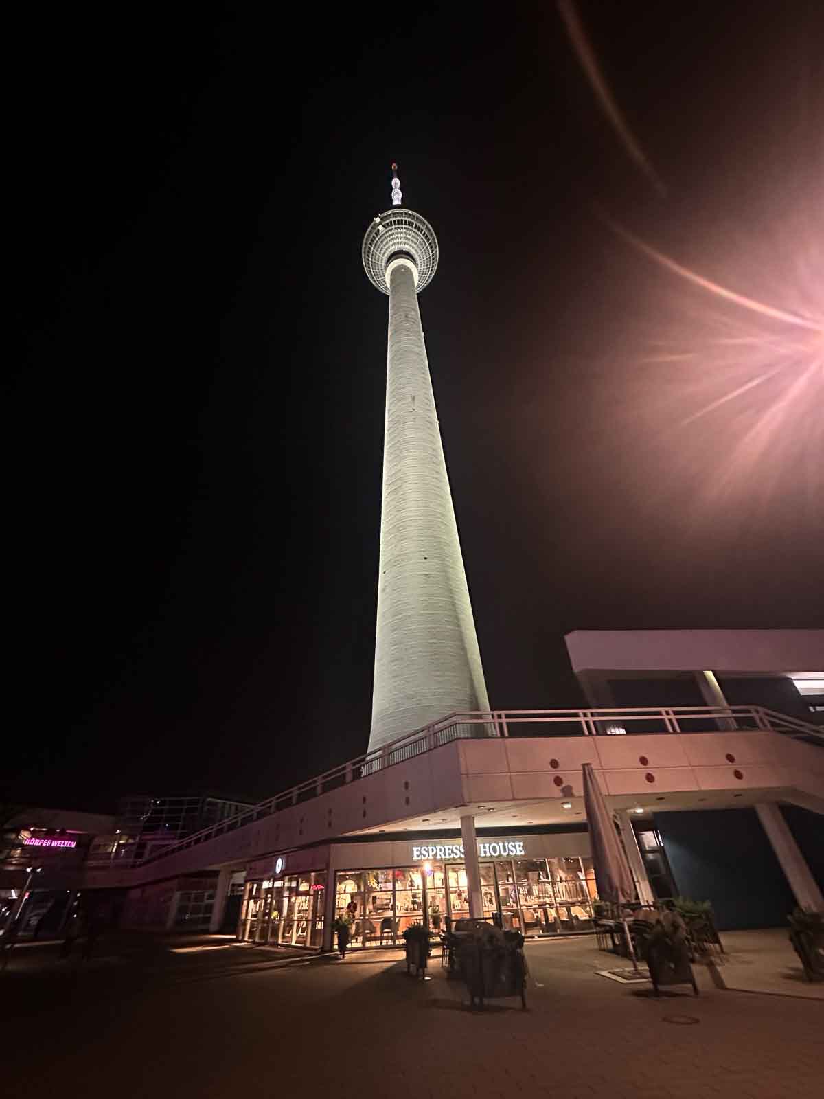 Nächtlicher Blick vom Fuß des Berliner Fernsehturms nach oben, darunter das beleuchtete Gebäude mit dem Espresso House am Alexanderplatz.