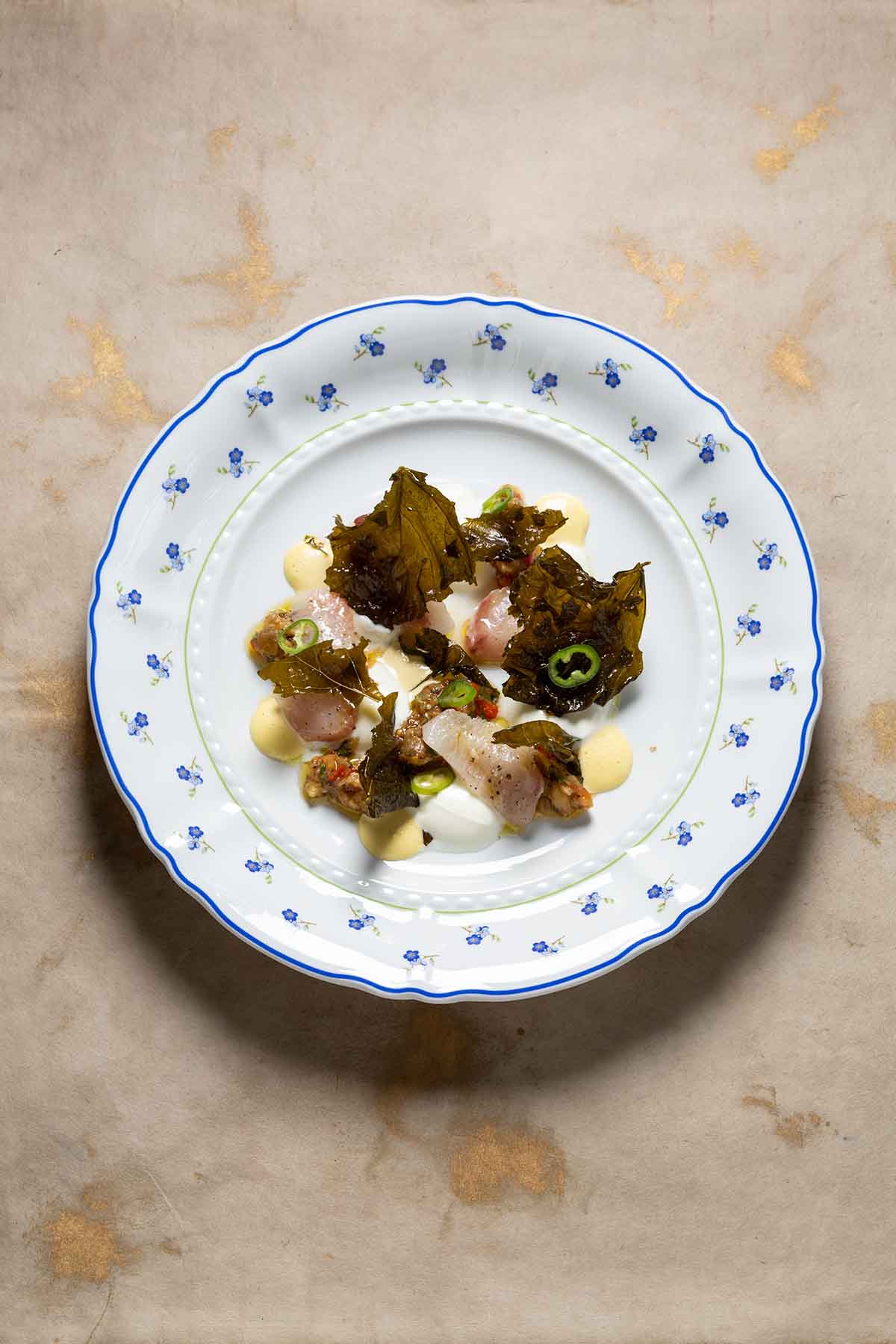 Feine Vorspeise im Berta Berlin auf floral verziertem Teller mit rohem Fisch, gefüllten Weinblättern, Olivenringen und cremigen Saucen, minimalistisch angerichtet.