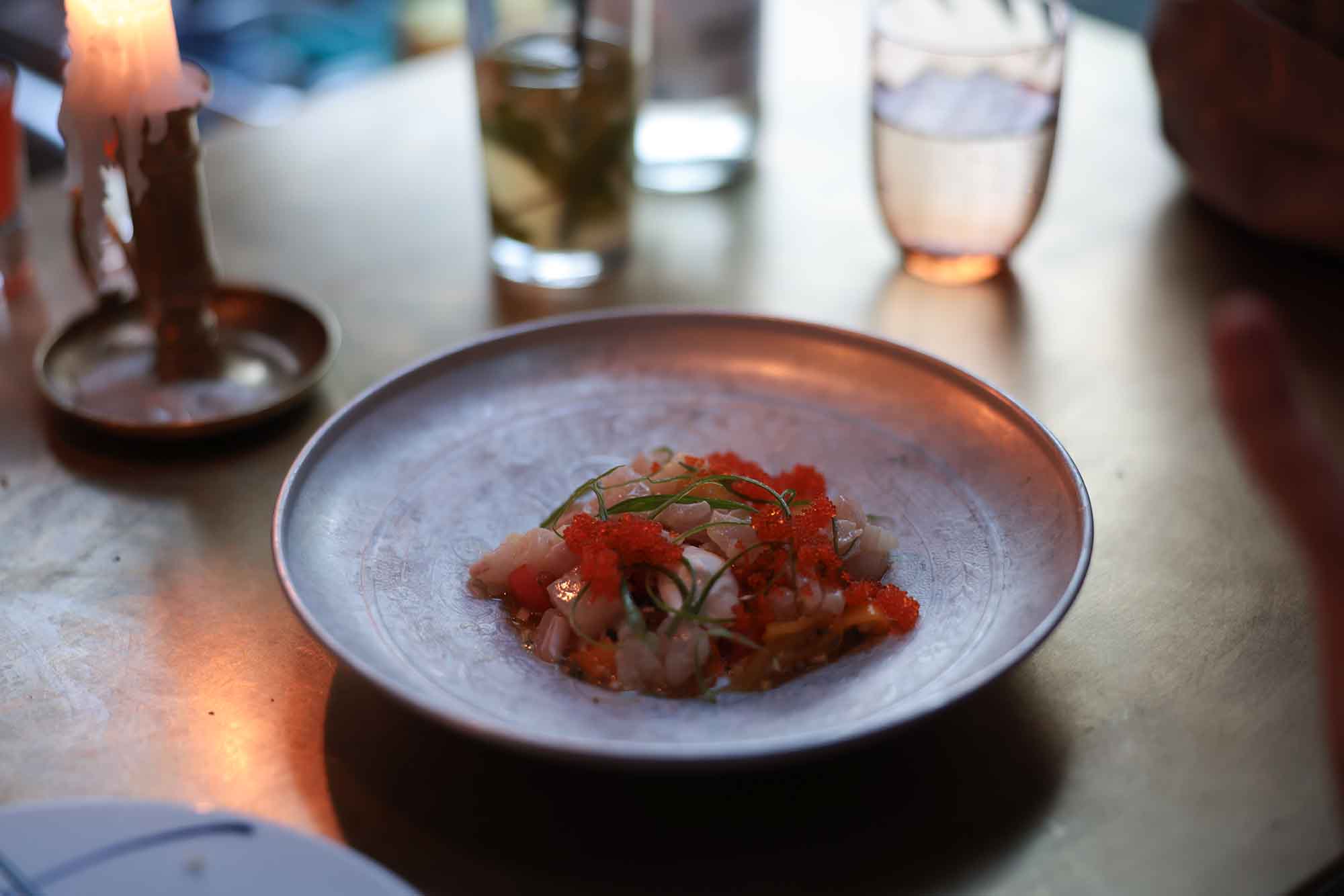 Detailaufnahme eines kunstvoll angerichteten Tellers im Berta Berlin mit rohem Fisch, Kräutern und leuchtend rotem Rogen bei Kerzenschein auf einem dunklen Tisch.