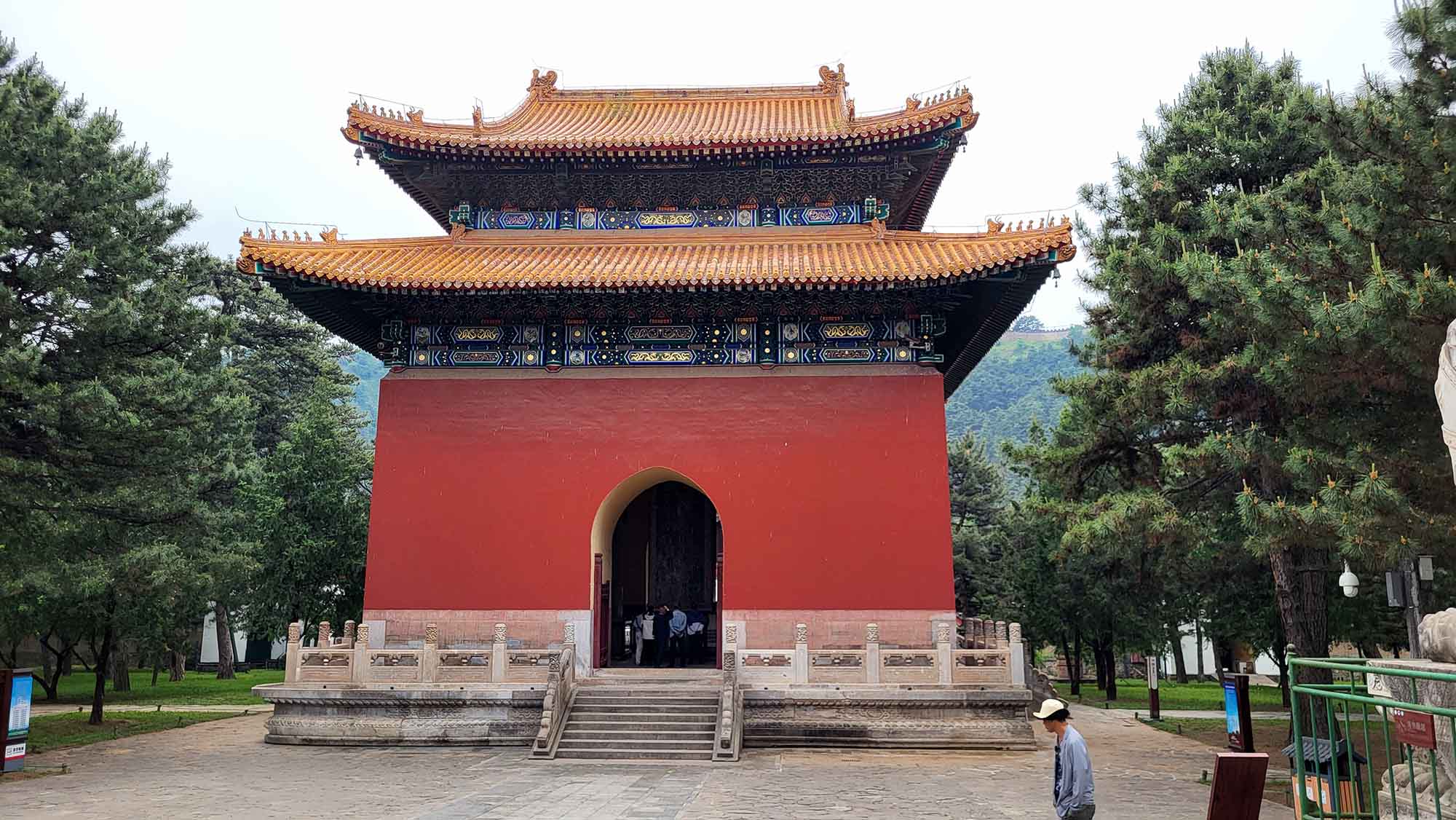 Die Reise beginnt am südlichen Ende der Anlage. Das Bergtor (Shanmen) wirkt mit seinen drei Durchgängen und dem typischen gelben Ziegeldach auf den ersten Blick han-chinesisch. Doch die massiven Steinlöwen, die den Eingang flankieren, erzählen eine eigene Geschichte.