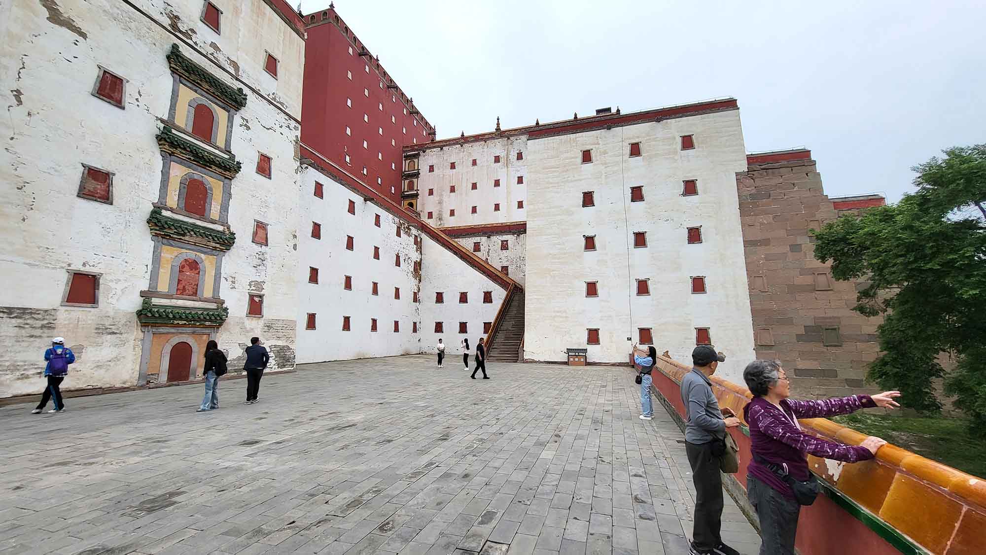 Schließlich steht man vor ihm: dem Dahongtai. Dieses monumentale Bauwerk ist das unangefochtene Herzstück des Putuo-Zongcheng-Tempels. Es ist eine massive Festung des Glaubens, 43 Meter hoch, mit dicken, tiefroten Mauern, die von zahlreichen quadratischen Fenstern durchbrochen werden. Viele dieser Fenster sind „blind“ – sie dienen rein der ästhetischen Symmetrie und unterstreichen den massiven Charakter der Architektur, ganz im Stil der tibetischen Dzong-Bauten.
