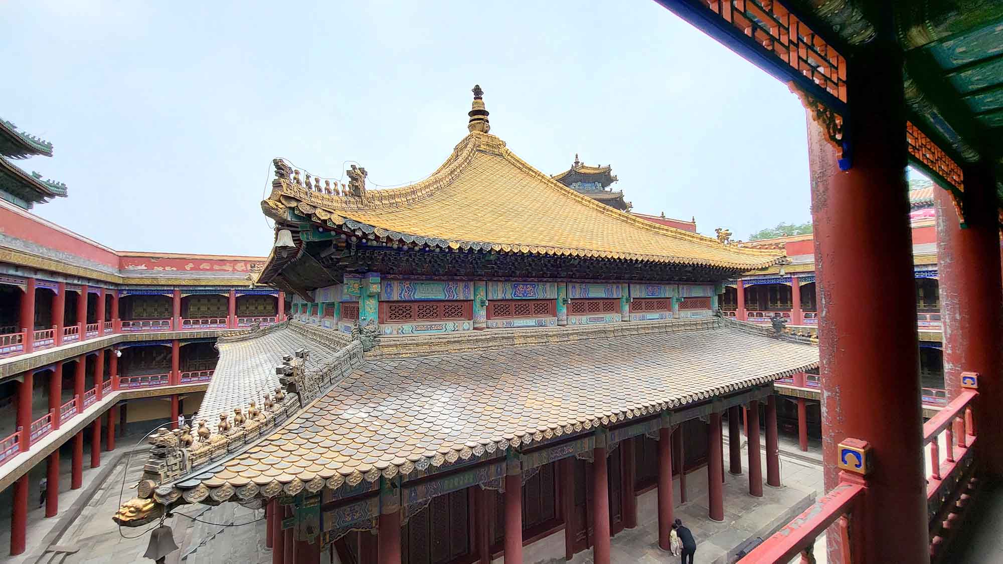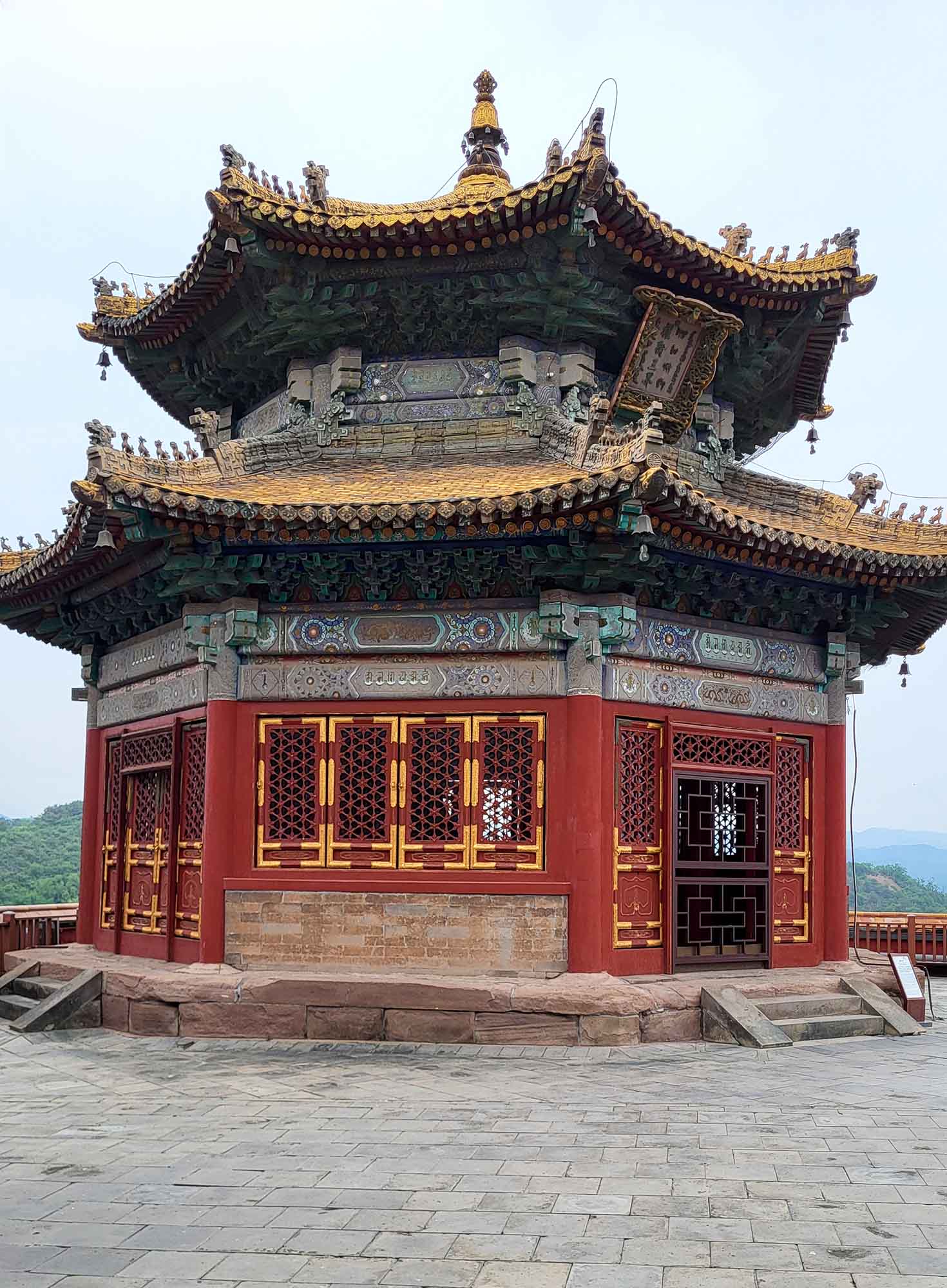 Das Dach dieser Halle ist mit reinem Gold überzogen. Es heißt, dass während der Bauphase unvorstellbare Mengen an Blattgold verbraucht wurden, um den Glanz des kaiserlichen Buddhismus weit über die Berge von Chengde strahlen zu lassen. Von der Terrasse des Roten Podests aus hat man zudem einen fantastischen Blick auf die umliegende Bergwelt. In der Ferne erkennt man den berühmten Keulenfelsen (Qingchuifeng), eine bizarre geologische Formation, die wie ein mahnender Finger aus dem Wald ragt.