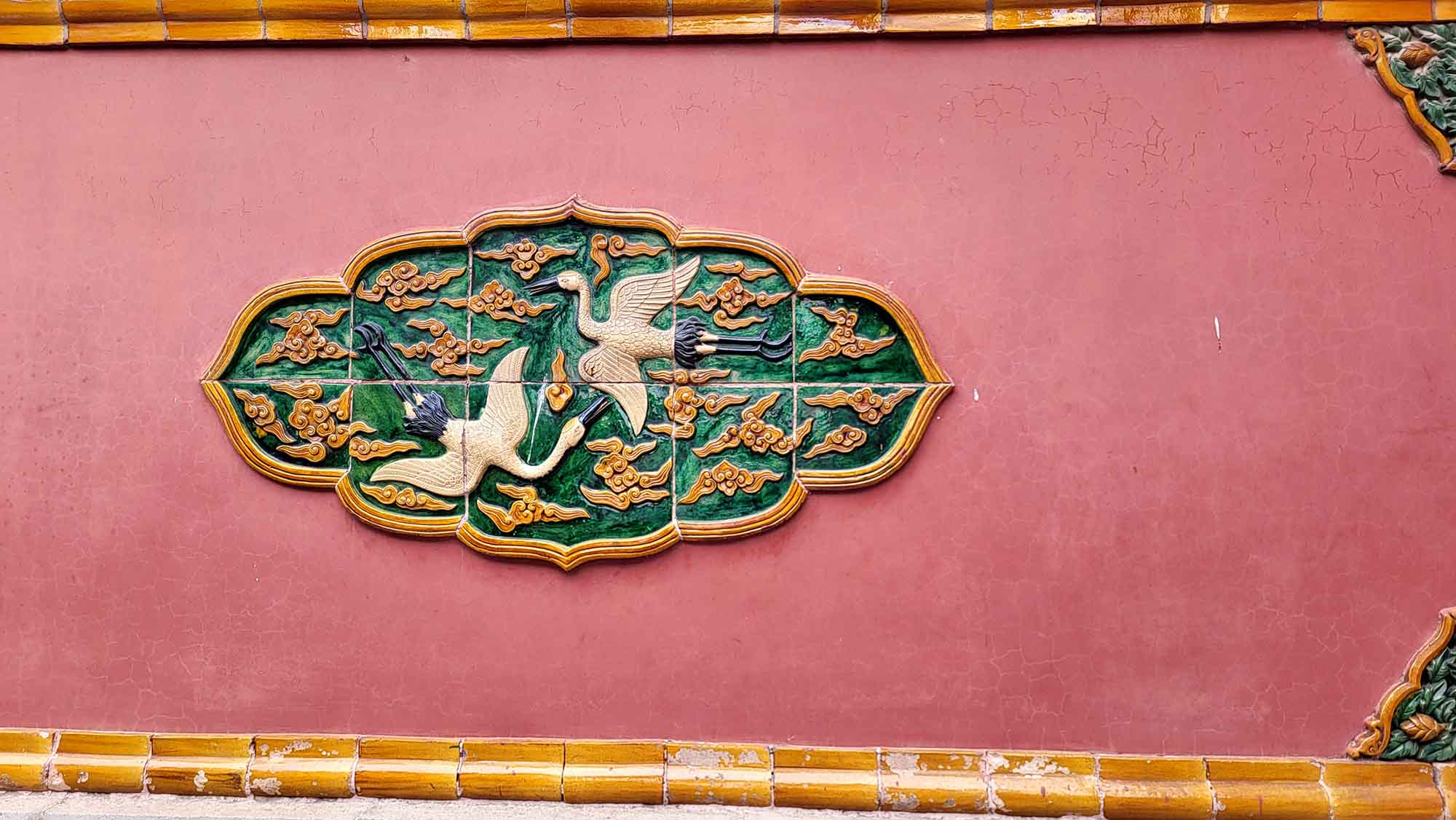 Im Inneren der Hallen entfaltet sich der ganze kaiserliche Prunk. Betritt man etwa die Chongzheng-Thronhalle, erblickt man einen erhöhten Thron mit goldglänzenden Drachenmotiven, flankiert von roten Säulen, die von vergoldeten Drachen umschlungen werden.