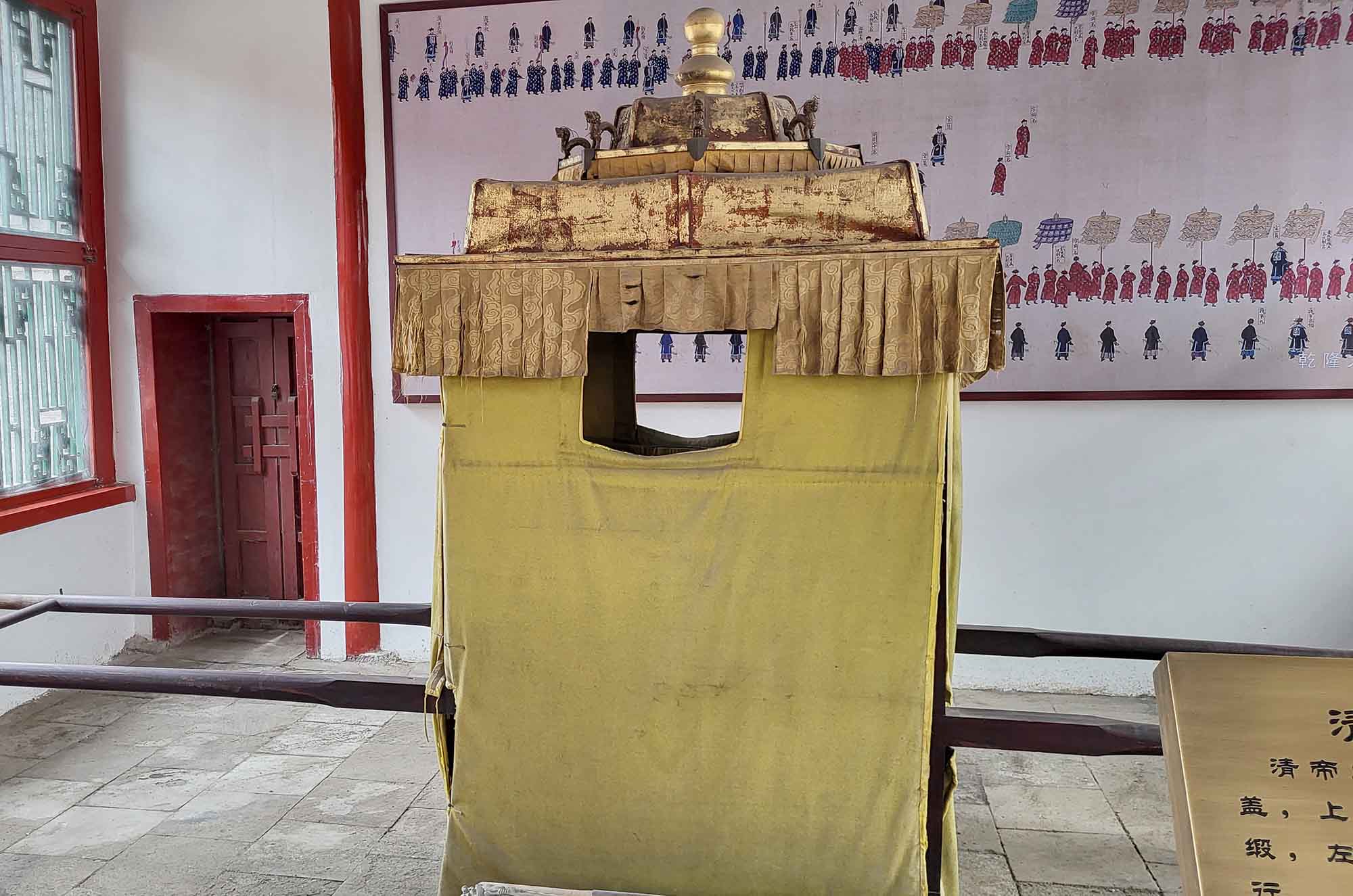 In einem Nebengebäude stößt man auf eine Vitrine mit zwei besonders eindrucksvollen Vasen: Die eine, weinrot mit filigranen Blumen- und Vogelmustern, die andere weiß mit neun bunt geschwungenen Drachen verziert. Solche Porzellanschätze gehörten einst zur kaiserlichen Sammlung und sind heute Teil der Ausstellung. Auch persönliche Gegenstände der Qing-Kaiser wie Siegel, Schriftrollen oder Schwerter (darunter angeblich das Schwert Nurhacis) kannst du bewundern.