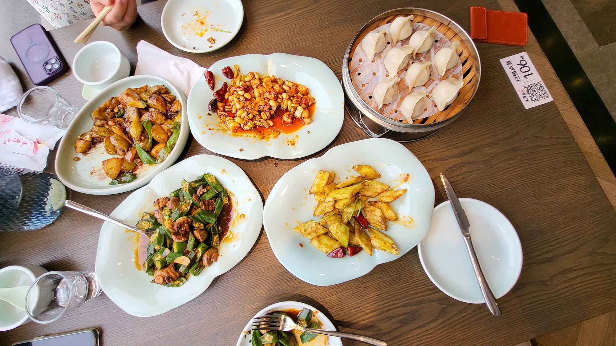 Irgendwann verlässt man den Palast fast beiläufig. Kein großer Abschied, kein letzter Blick zurück. Draußen geht Shenyang weiter. Straßen, moderne Gebäude, Verkehr. Und jetzt macht sich der Hunger breit. Wir finden ein Restaurant in der Nähe, hell, voll besetzt. Menschen sitzen an runden Tischen, teilen Gerichte, reden laut, lachen. Auf dem Tisch dampfen Teigtaschen, scharfe Bohnen, gebratene Auberginen, grüne Bohnen mit Chili. Alles kommt gleichzeitig, alles wird geteilt. Beim Essen lassen wir das Erlebte Revue passieren.