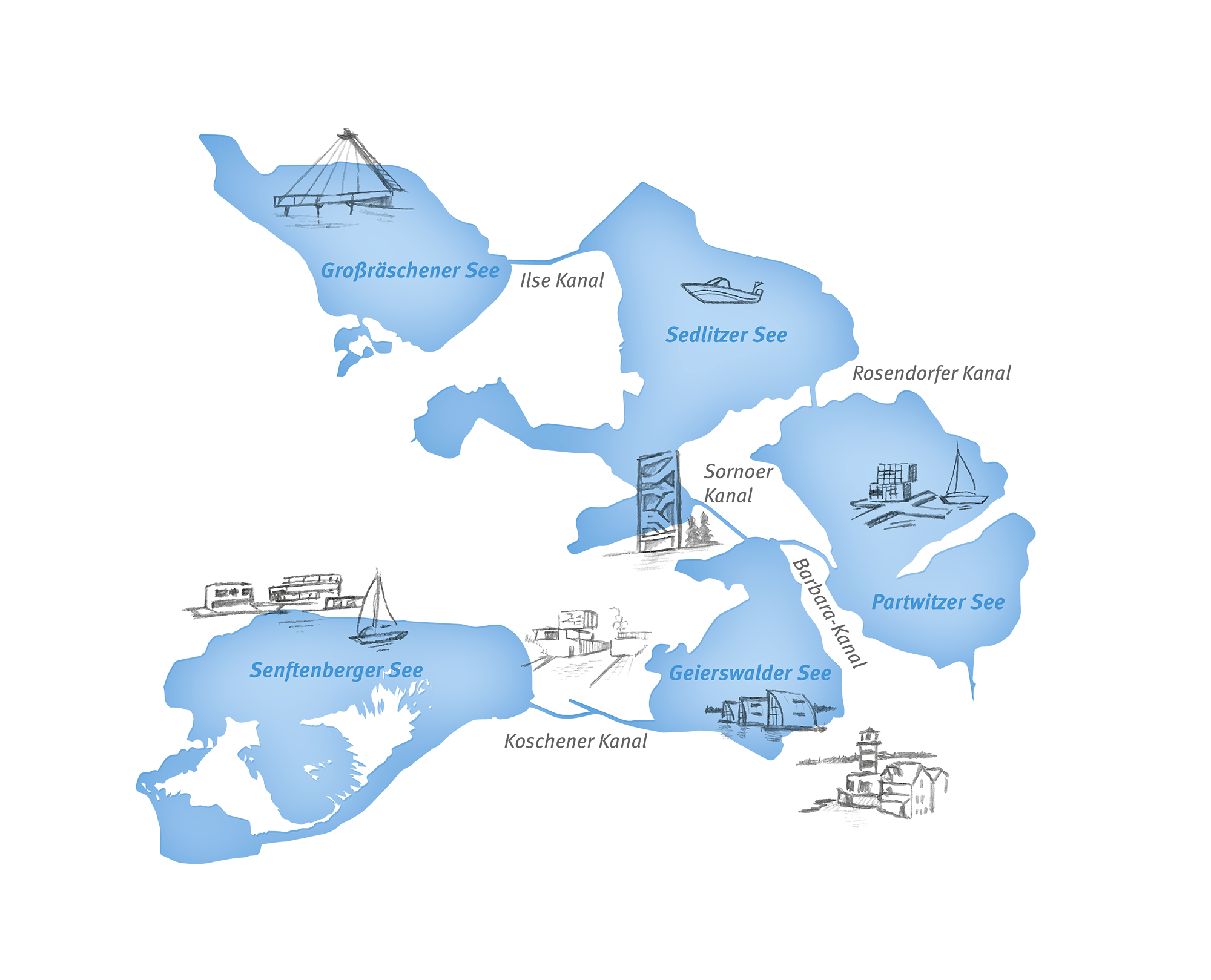 Bislang waren der Koschener Kanal zwischen Senftenberger und Geierswalder See sowie der Barbara-Kanal zwischen Geierswalder und Partwitzer See die einzigen befahrbaren Wasserstraßen der Region. Ende Juni 2026 öffnen drei weitere schiffbare Kanäle. Sie verbinden den zentral gelegenen Sedlitzer See mit den benachbarten Wasserflächen: Der Sornoer Kanal führt zum Geierswalder See, der Rosendorfer Kanal zum Partwitzer See. Ein spektakuläres Bauwerk ist der Ilse Kanal, der im Verlauf bis zum Großräschener See mehrere Bahnstrecken und eine Bundesstraße unterquert.