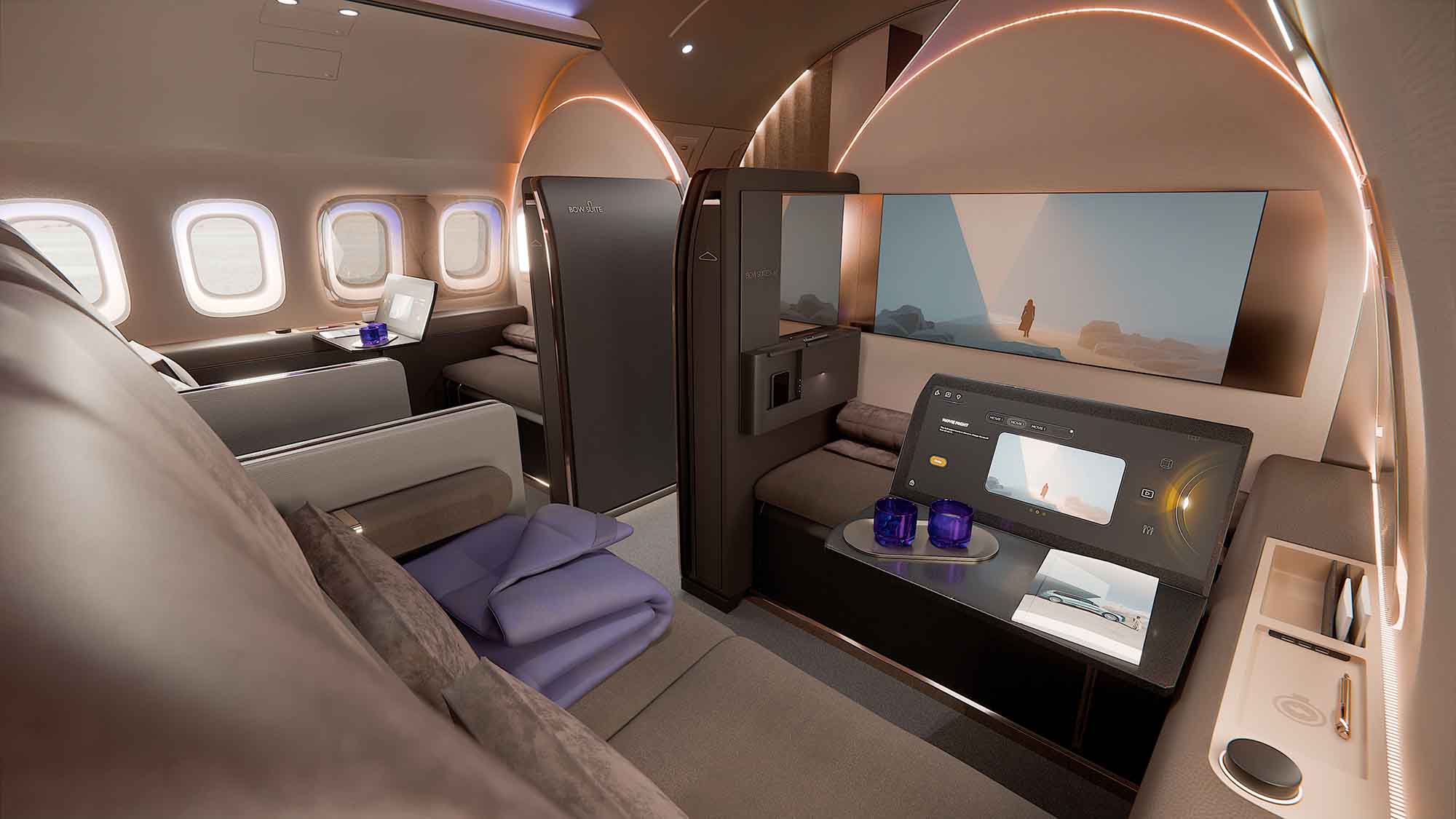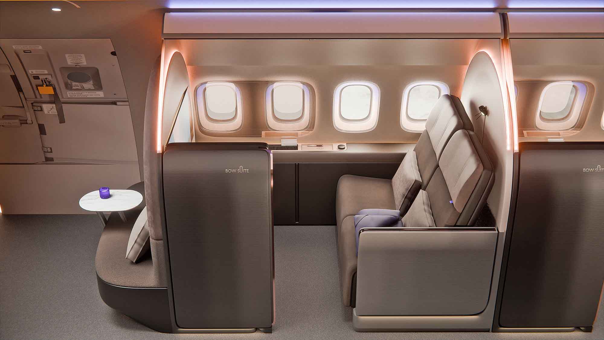 Die gemeinsam mit Designworks entwickelte „Bow Suite“ ist von Bögen, weichen Formen, klaren Linien und edlen Materialien geprägt. Akustische Abschirmungen, Stimmungsbeleuchtung, Duftoptionen und integrierte Stauraumlösungen verbinden Gestaltung, Komfort und Funktionalität und schaffen ein hierfür hohes Maß an Wohlbefinden.