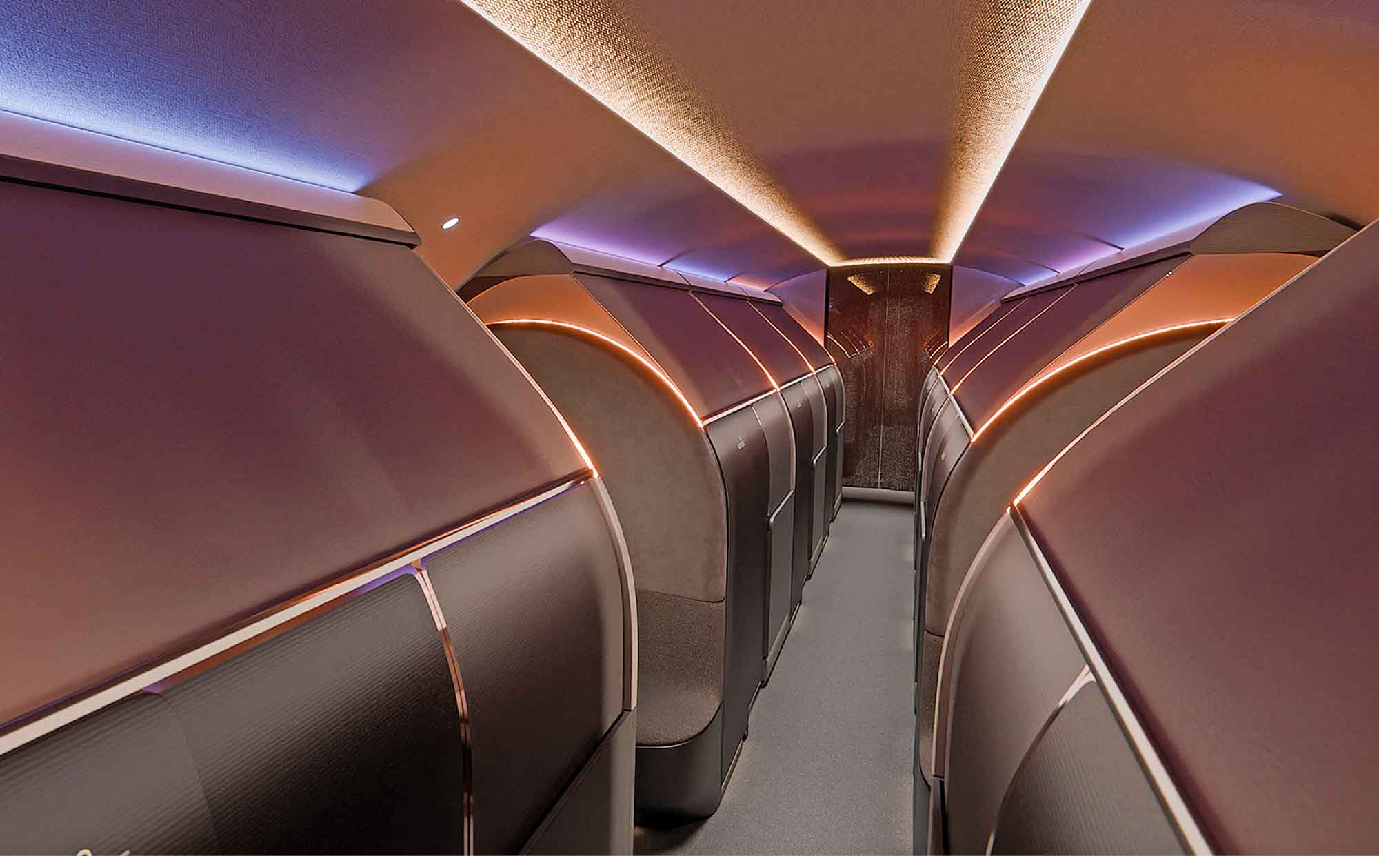 Die Zielgruppe des Designs ist nicht der einzelne VIP-Reisende, sondern eine Gruppe exklusiver Nutzer:innen – etwa ein Unternehmensvorstand, ein professionelles Sportteam oder eine tourende Band. Jede private Suite bietet Platz für einen oder zwei Reisende und kann für private Meetings oder gemeinsames Dining genutzt werden. Jede Suite verfügt zudem über persönlichen Stauraum – ideal für Musikinstrumente, professionelles Equipment oder persönliche Gegenstände.